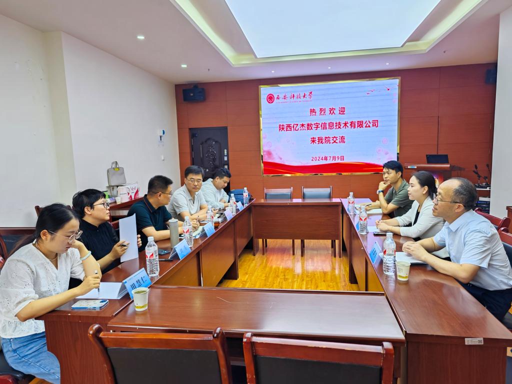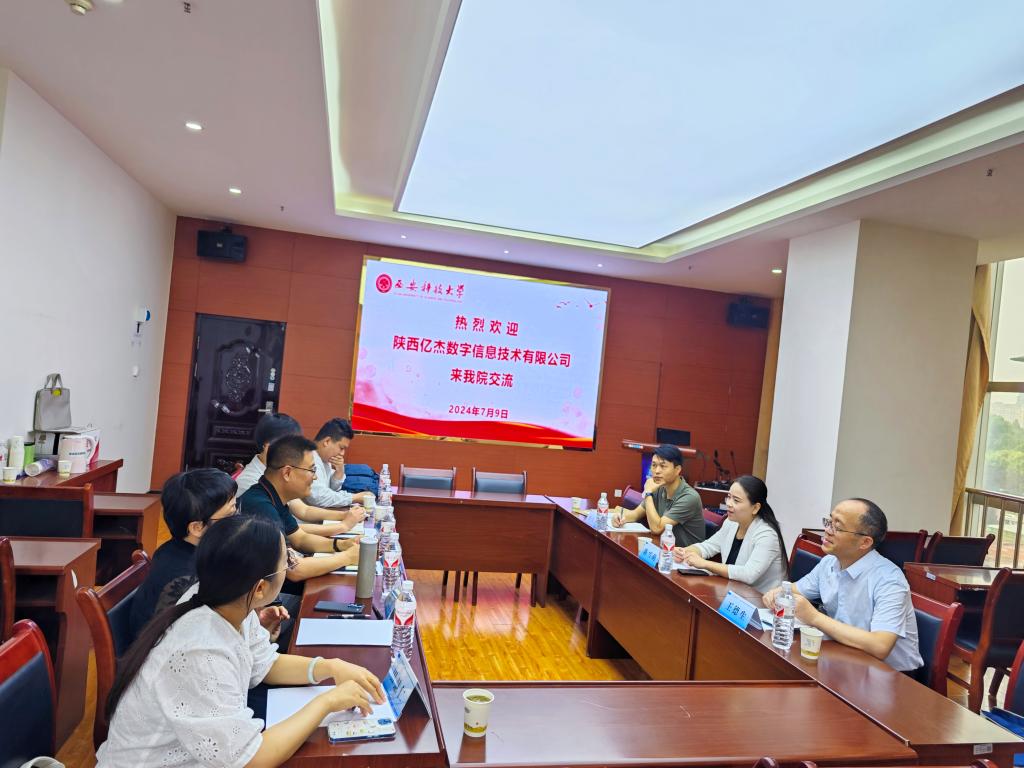 7月9日上午,陕西亿杰数字信息技术有限公司总经理陈雪萌、副总经理王德生、总工程师孙飞飞一行来我院调研交流。院长李朋飞、副院长史晓亮、遥感系主任刘英老师、地信系主任张东海老师、教师代表田慧仁老师参加了交流会。