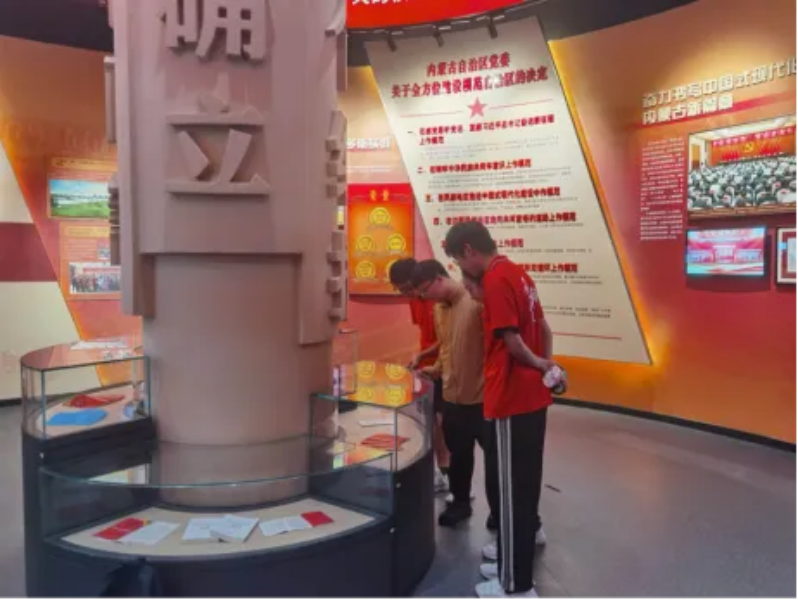 进入园内,实践团成员在铸牢中华民族共同体意识展览馆进行参观学习。该展览馆共分为序厅、同根同源共铸中华、交融汇聚多元一体、开天辟地历史巨变、伟大创举崭新时代、携手共进伊金霍洛、同心共筑伟大复兴等7个部分,集中展现了各民族交往交流交融,共同缔造、发展、巩固、统一伟大祖国的历史。同学们边看边听着讲解,对中华民族共同体意识拥有了更为深切的认知。在学习过程中实践团成员们还了解到了伊金霍洛旗文化产业园为促进民族团结进步付出的努力以及取得的成果。