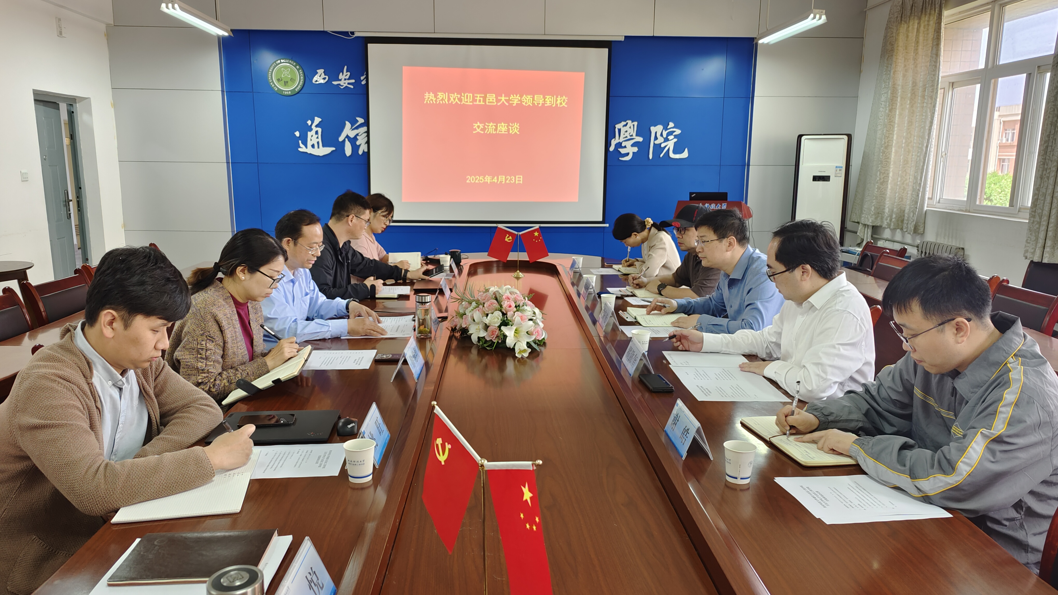 4月23日上午,五邑大学研究生处处长曾庆光、电子与信息工程学院副院长翟懿奎、电子与信息工程学院院长助理、智能科学与技术系主任王天雷、研究生处学生管理科科长黎淑贞、电子与信息工程学院通信工程系副主任谢皓一行来通信学院交流座谈。学院党委书记张剑、副院长黄晓俊、通信工程系、电子信息工程系负责人及相关学科秘书参加了座谈会。